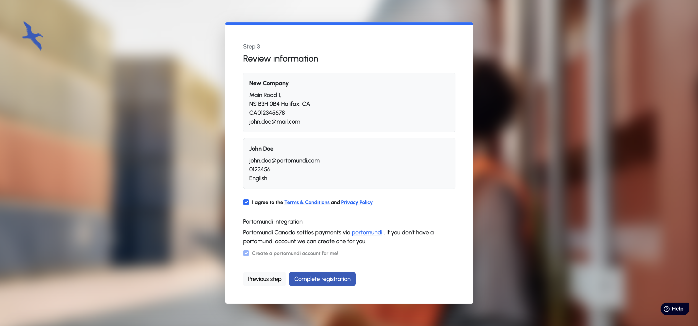 | Enter your company information | Enter your "first user" information (the administrator) | Check the provided information, accept the T&Cs and register. Note: a Portomundi wallet account will automatically be created for you. |