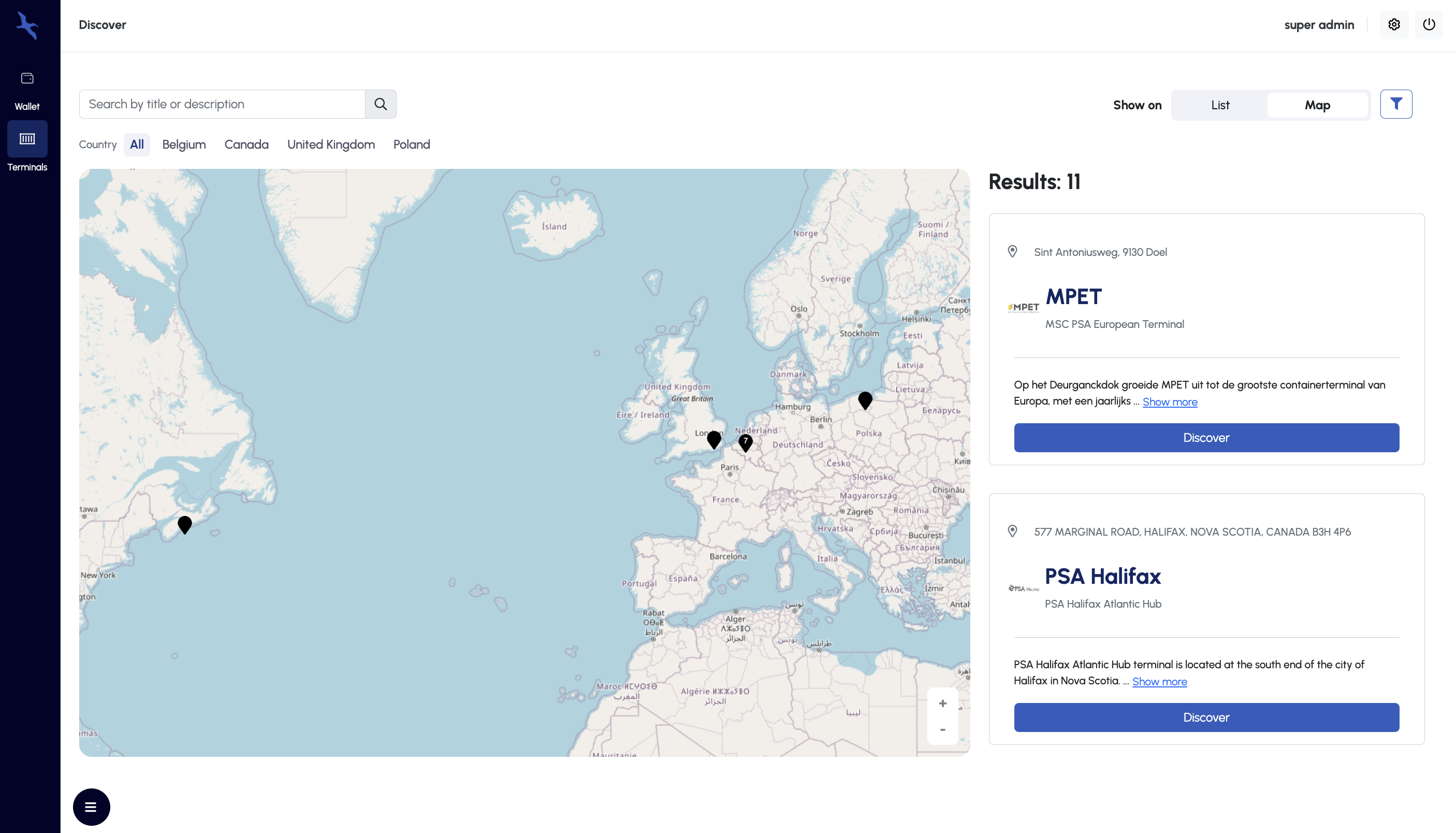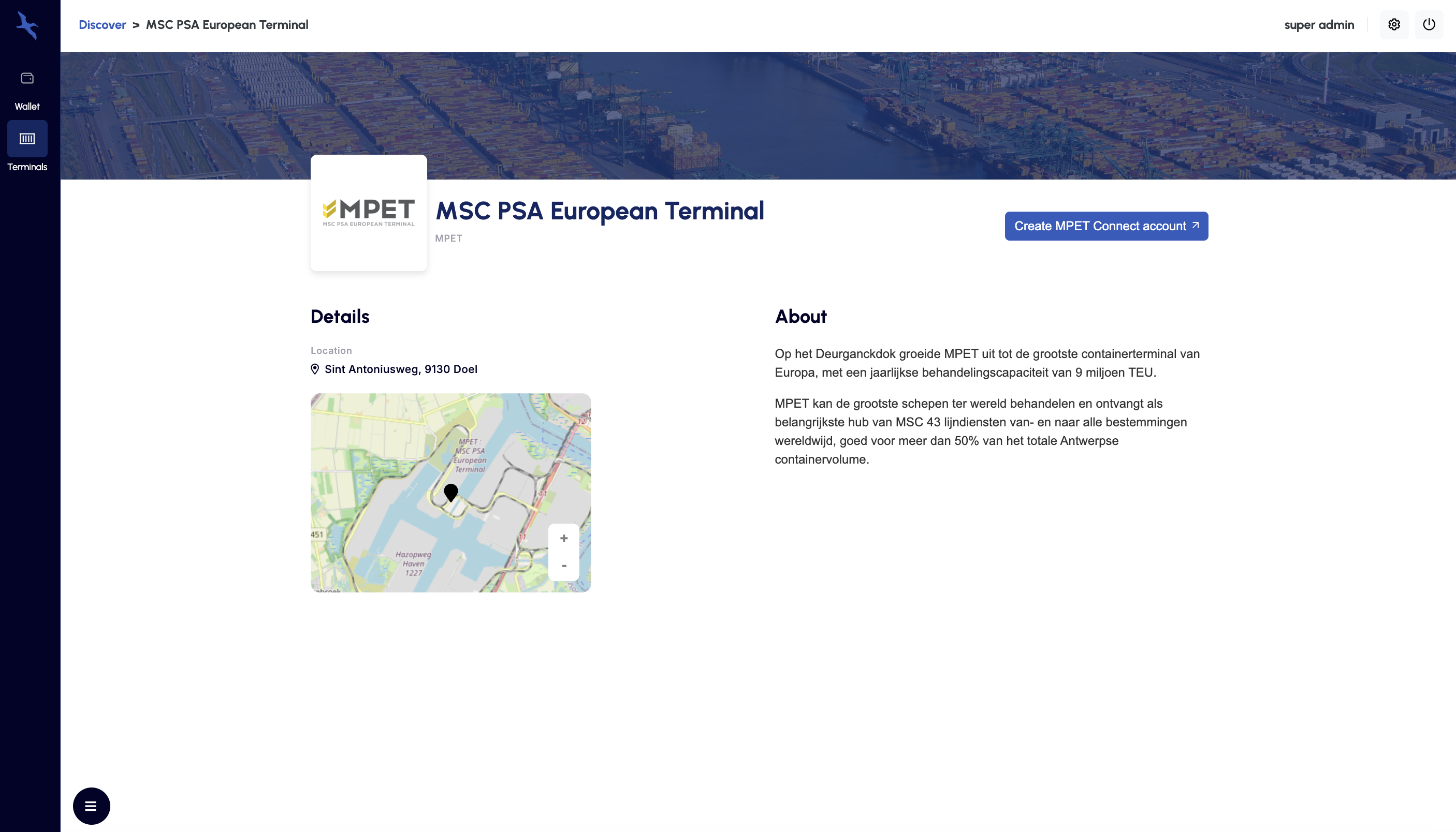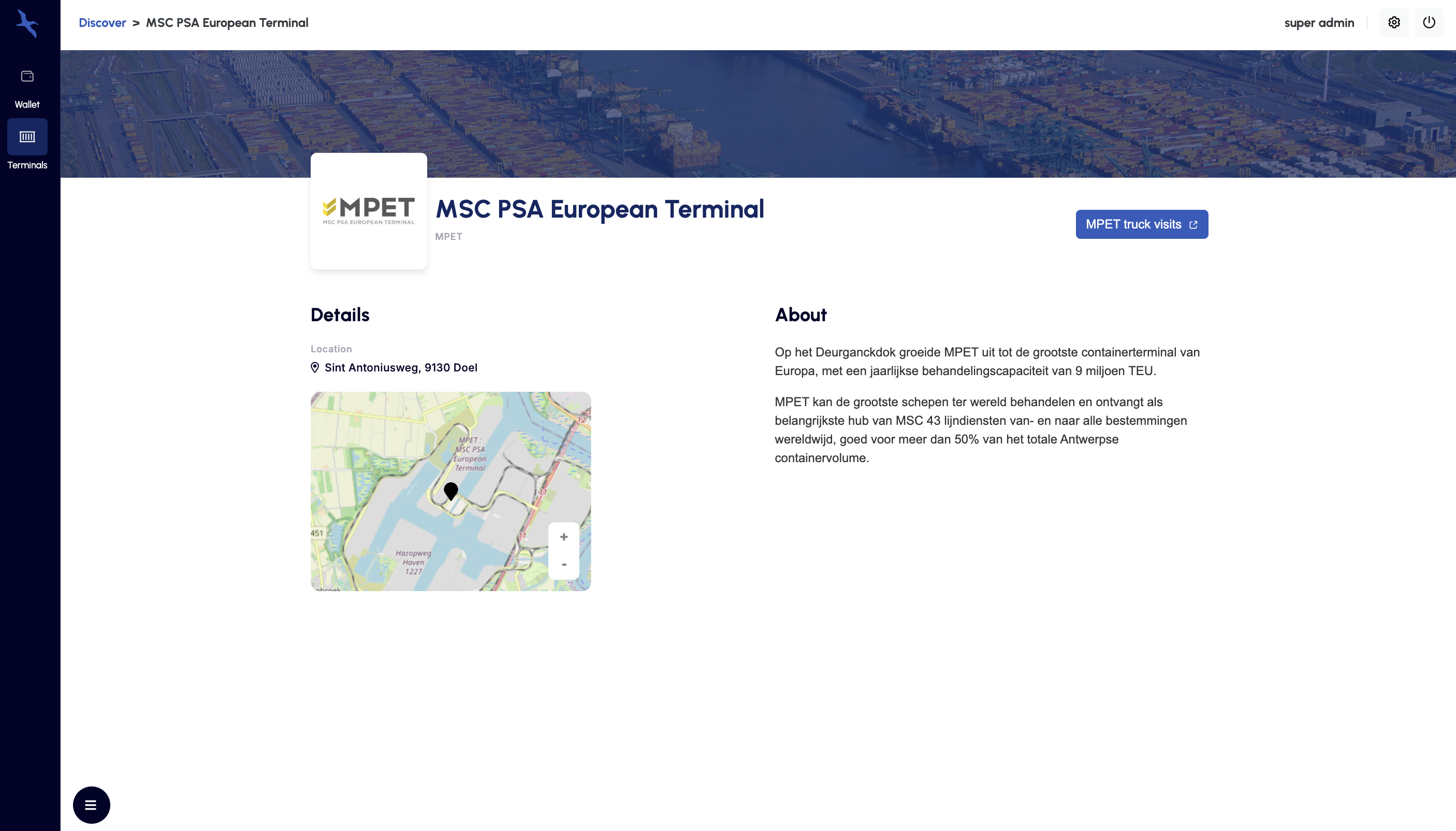 Browse through the Terminal locations that are listed in the right navigation pane (or navigate via the map view) until you find the MPET terminal and click on the blue Discover button. You will be redirected to the MPET terminal page.