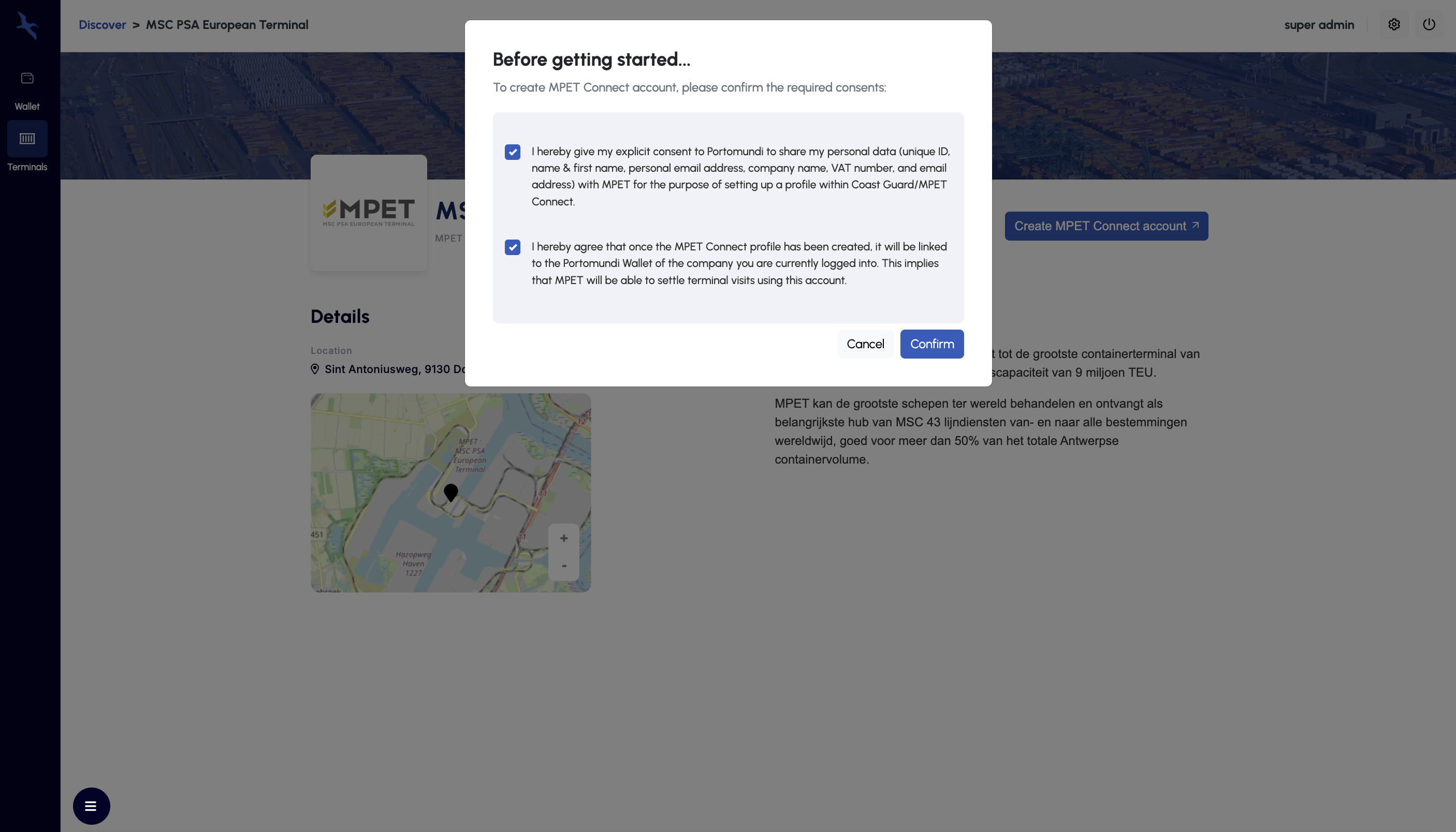 Now click on the Create MPET Connect account button which will make a modal window appear. Carefully review and select the required consent checkboxes, then click the Confirm button to continue with the MPET Connect account creation process.