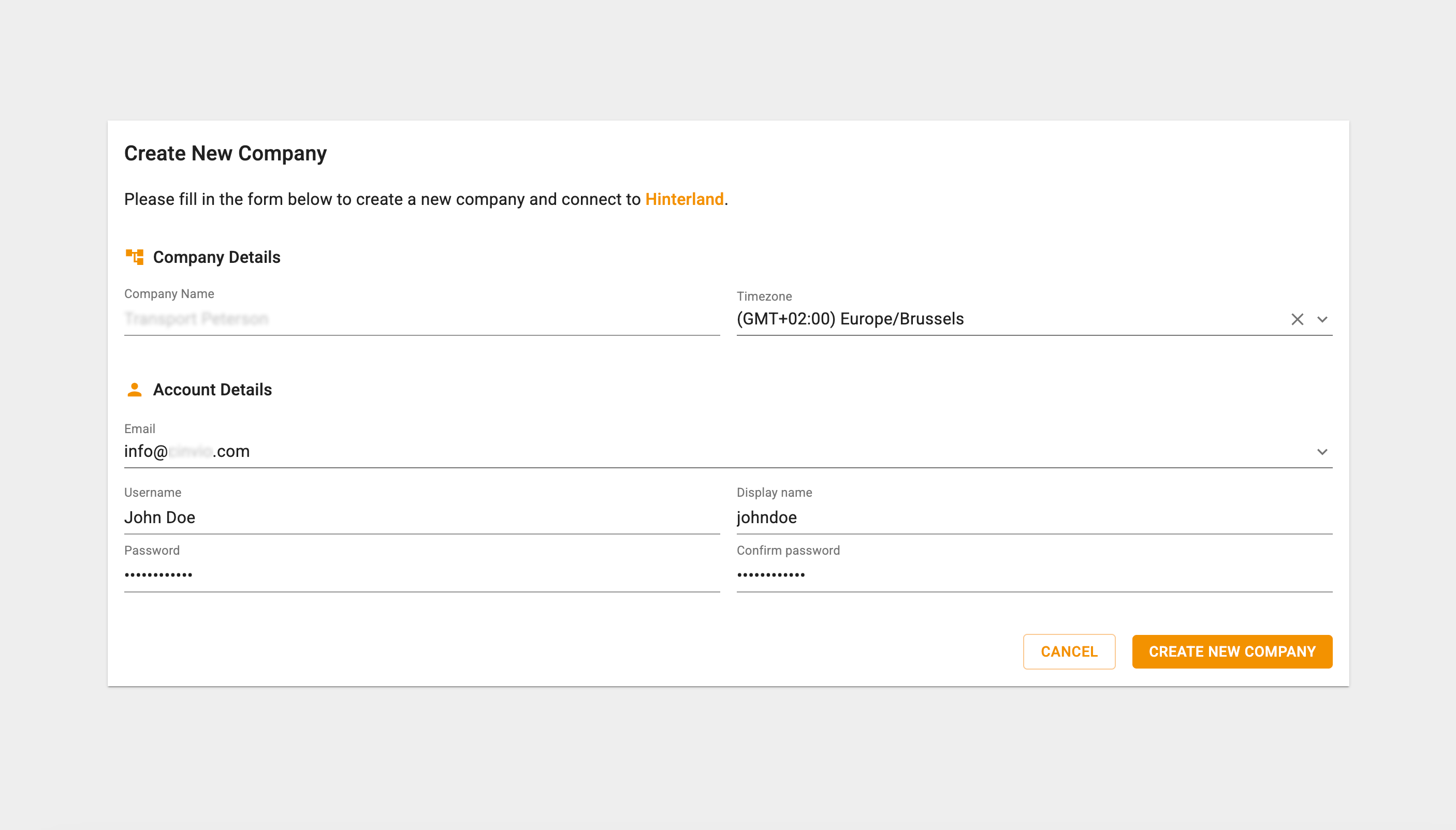 If you select the Create new company button, you will be asked to complete the open fields in the form below and confirm by clicking on the Create new company button.